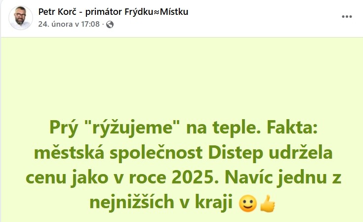 Poté, co jsme zveřejnili jakýsi seznam hříchů v podobě černé listiny našeho města, kde jeden z nich zní RADNICE ŠROUBUJE CENY ZA TEPLO A ZISKY DISTEPU, přispěchal primátor Petr Korč se svým postem ve stylu „že prý“, který je výsměchem všem lidem, kterým se ceny tepla zdají drahé. A že jich je!...